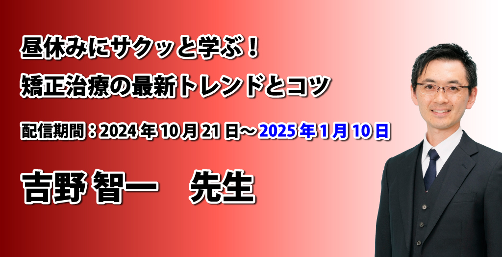 本セミナーでは、矯正治療の最新トレンドを俯瞰し、実践に役立つ情報を30分で効率よく提供します。まず、矯正治療の全体像と進化の方向性について解説した後に、何かと話題のアライナー矯正の基本と成功のコツを具体的に解説します。最後にマルチブラケット治療の最新知識をアップデートし、臨床ケーススタディを通じて実際の応用方法を学んでいただきます。短時間で最新の矯正治療知識を効率よく学べるセミナーです。